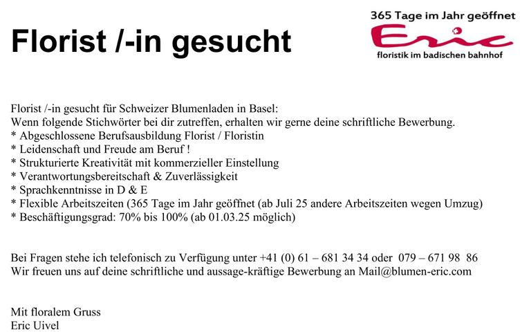 Florist /-in gesucht für Schweizer Blumenladen in Basel: