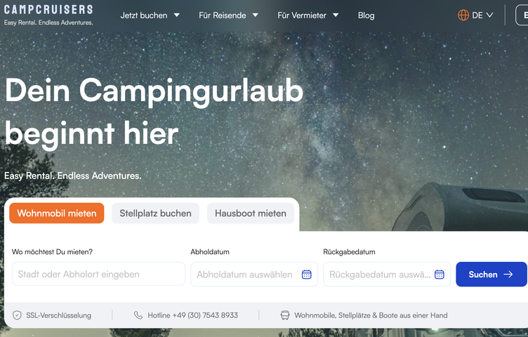 Campcruisers ist die Buchungsplattform für Campingfans und Outdoor-Enthusiasten. Von Wohnmobilen, Wohnwagen, 4WD-Campern und Hausbooten bis hin zu Stellplätzen und touristischen Attraktionen – bei uns können Reisende alles rund um ihren Traum-Roadtrip aus einer Hand buchen. Bald erleichtert sogar ein KI-gestützter Urlaubsplaner die Reiseplanung für längere Abenteuer!
