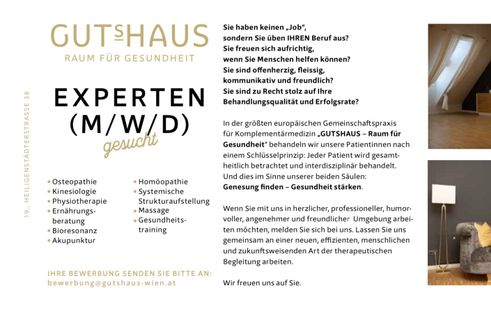 Sind Sie Ergotherapeut:in und möchten in einer herzlichen und professionellen Umgebung arbeiten, in der Sie Ihre Leidenschaft zur Berufung machen können? Im "GUTsHAUS - Raum für Gesundheit" in Wien bieten wir Ihnen die Möglichkeit, Teil der größten europäischen Gemeinschaftspraxis für Komplementärmedizin zu werden. Wir legen großen Wert auf eine ganzheitliche und interdisziplinäre Behandlung unserer Patientinnen und Patienten, um Genesung zu finden und Gesundheit nachhaltig zu stärken. Wenn Sie stolz auf Ihre Behandlungsqualität und Erfolgsrate sind und Freude daran haben, Menschen zu helfen, dann freuen wir uns darauf, Sie kennenzulernen. Bei uns erwartet Sie ein freundliches und humorvolles Arbeitsumfeld, in dem Effizienz und menschliche Zuwendung Hand in Hand gehen. Werden Sie Teil unseres Teams und gestalten Sie mit uns eine zukunftsweisende Art der therapeutischen Begleitung.