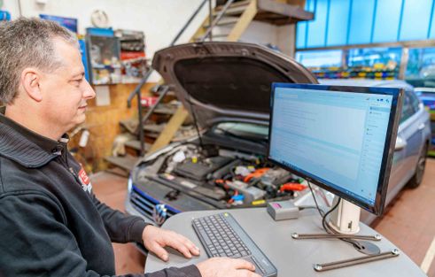 Um mit neuen Entwicklungen in der Fahrzeugtechnik Schritt zu halten, arbeiten wir mit modernster Diagnose- und Werkstatttechnik.